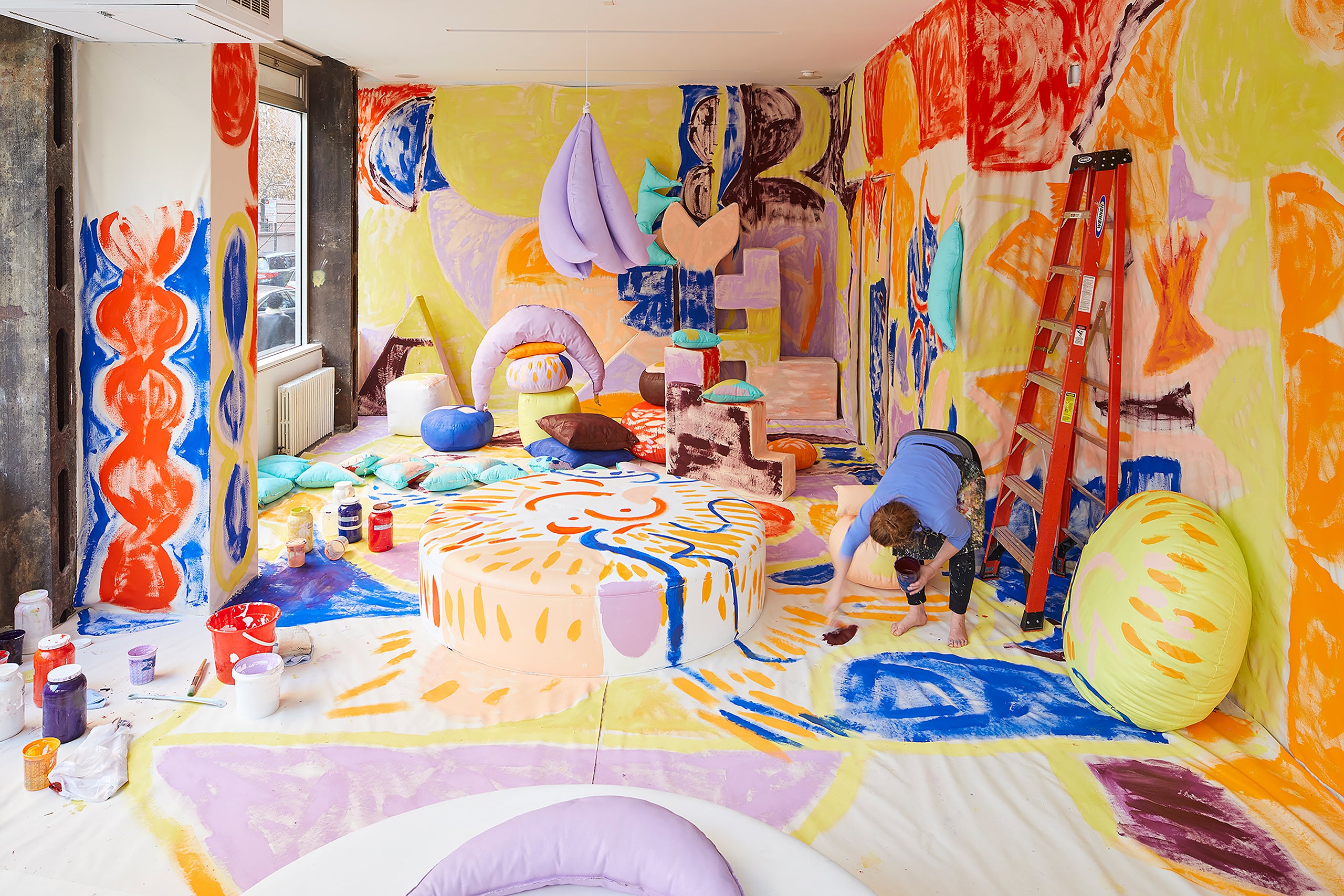 Clark's work with Fort Makers—from painting on old wool blankets to her more recent canvas poufs and ottomans—has often centered play and tactility as modes of world building. In the days leading up to the opening, the windows to 38 Orchard will be left uncovered while Clark paints, turning the installation process into a live painting for passersby. Keeping with Fort Makers’ signature eye for color, Clark will paint the padded space in lavender, cobalt, chartreuse, poppy red, maroon, mint and pumpkin orange. Within this vibrant backdrop, the smaller stuffed pieces camouflage into a compositionally fluid but formally consistent landscape of bold hues and soft surfaces.